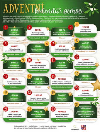 Již popáté letos vedení Brandýsu nad Labem-Staré Boleslavi spolu s MAS – Střední Polabí připravili Adventní kalendář pomoci. Zájemci si mohou vybrat ze čtyřiadvaceti políček, z nichž každé skrývá možnost konkrétní pomoci místním lidem v tíživé situaci. „Vždy oslovujeme místní organizace, které působí ve čtyřech základních oblastech: rodiny s dětmi, senioři, lidé ohrožení sociálním vyloučením a lidé se zdravotním znevýhodněním,“ uvedlo vedení města.