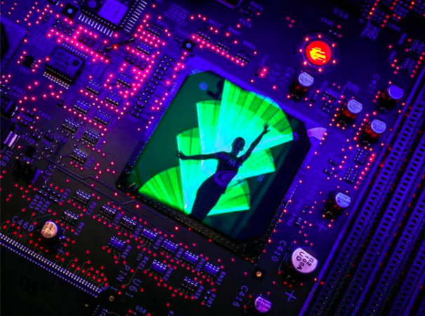 Největší počin autora – postava v procesoru základní desky od PC (tato fotka si vyžádala komplikovanější přípravu před focením, příprava trvala hodinu, byly použity dva stativy, nejdříve fotoaparát mířil na základní desku a následně se, v průběhu expozice, přesunul na druhý stativ, kde mířil na modelku).
