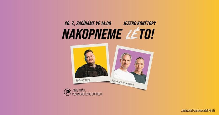 Zlatým hřebem programu bude živě natáčený podcast, kde se Zdeněk Hřib a Ivan Bartoš ocitnou přímo pod palbou otázek od influencera a stand-up komika Big Daddy Mikkyho. Tohle nebude žádné uhlazené PR – čekejte nekompromisní dotazy, vtipné momenty i nečekané odpovědi. Padnou i otázky na největší pirátské průšvihy, na to, co ve vládě raději zůstalo nevyřčeno, i na momenty, kdy šlo opravdu do tuhého. Další otázky můžete sami navrhnout na nakopnemeto.pirati.cz/nakopneme-leto – ty nejpálivější padnou přímo na místě před publikem i kamerami.