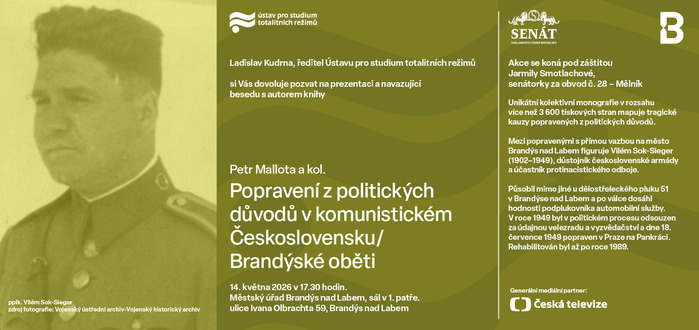 Publikace o rozsahu 3 600 stran obsahuje více než 2 500 archivních dokumentů a fotografií a představuje nejucelenější souhrn životních příběhů těchto lidí. V sále Městského úřadu v ulici Ivana Olbrachta 59 se 14. května 2026 od 17:30 uskuteční ojedinělá prezentace věnovaná tragickému osudu československého důstojníka Viléma Soka-Siegera. Setkání s historikem Petrem Mallotou totiž představuje unikátní příležitost dozvědět se více o životě muže, který se postavil komunistickému režimu aktivně na odpor jako člen odbojové organizace Praha-Žatec. Ta na jaro 1949 plánovala protikomunistické povstání.